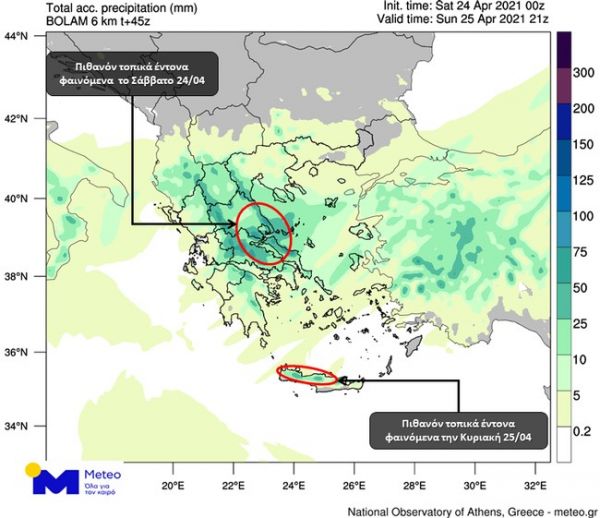 Στη Βόρεια Κρήτη οι βροχές πιθανόν να είναι κατά τόπους έντονες. Το αθροιστικό ύψος βροχόπτωσης για το Σαββατοκύριακο 24/04 – 25/04, παρουσιάζεται στο Χάρτη 1, ο οποίος ακολουθεί.