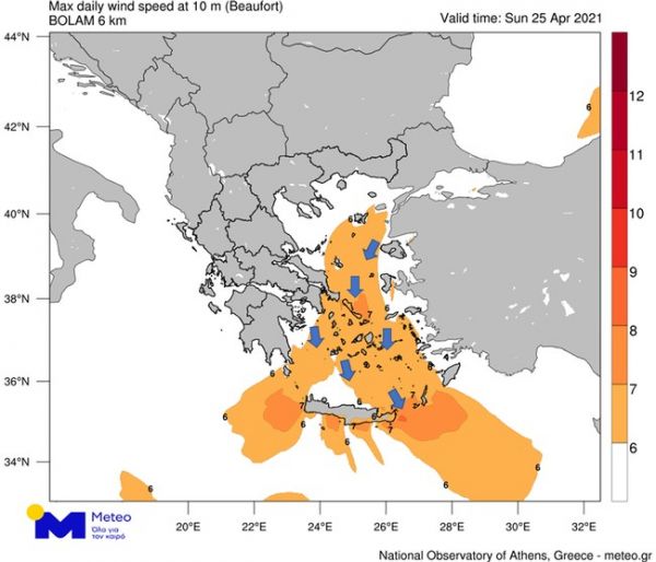 Παράλληλα, ενίσχυση θα παρουσιάσουν οι βόρειοι άνεμοι το Σάββατο 24/04 στα νότια πελάγη, ενώ σύμφωνα με τα τελευταία προγνωστικά στοιχεία του Εθνικού Αστεροσκοπείου Αθηνών / Meteo.gr, η μέγιστη έντασή τους αναμένεται την Κυριακή των Βαΐων 25/04, όπου στο Κεντρικό και Νότιο Αιγαίο θα φτάνει τα 6-7 μποφόρ. Στο Χάρτη 2, παρουσιάζονται οι εκτιμώμενες μέγιστες εντάσεις και η διεύθυνσή τους για την Κυριακή των Βαΐων 25/04.