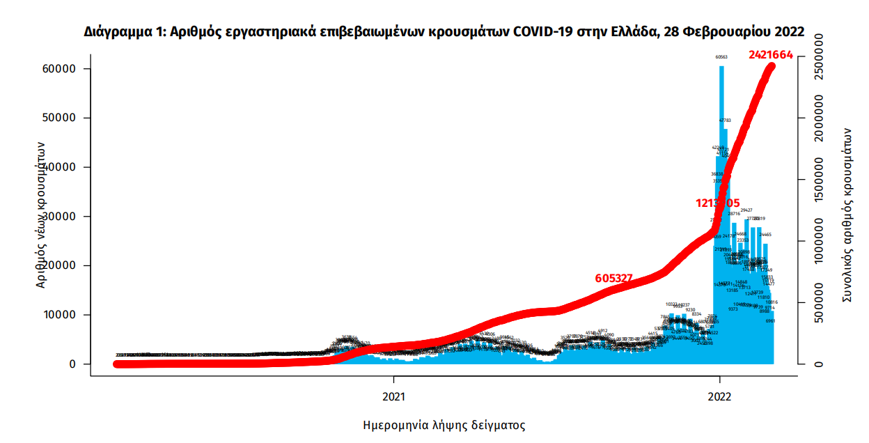 Τα νέα εργαστηριακά επιβεβαιωμένα κρούσματα της νόσου που καταγράφηκαν τις τελευταίες 24 ώρες είναι 16.274 , εκ των οποίων 36 εντοπίστηκαν κατόπιν ελέγχων στις πύλες εισόδου της χώρας. Ο συνολικός αριθμός των κρουσμάτων ανέρχεται σε 2.421.664 (ημερήσια μεταβολή +0.7%), εκ των οποίων 49.5% άνδρες.