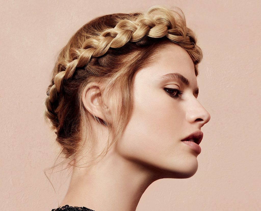 6. Με αυτόν τον τρόπο συνεχίζουμε το πλέξιμο στο πλάι του κεφαλιού, μετά στο μέτωπο και τη στερεώνουμε στο άλλο αφτί με τσιμπιδάκια ή φουρκέτες.