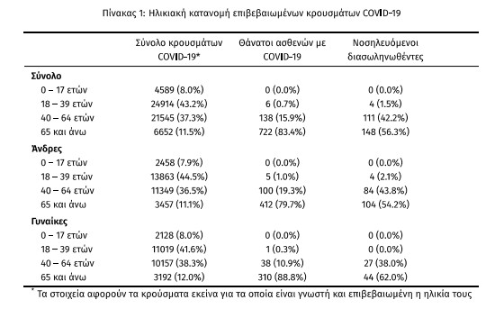 Η μέση ηλικία των κρουσμάτων είναι 39 έτη (εύρος 0 έως 103 ετών), ενώ η μέση ηλικία των θανάτων είναι 79 έτη (εύρος 25 έως 103 ετών). Η ηλικιακή κατανομή των (α) συνολικών κρουσμάτων, (β) των περιστατικών που κατέληξαν σε θάνατο και (γ) των ασθενών που νοσηλεύονται διασωληνωμένοι, είναι η ακόλουθη: