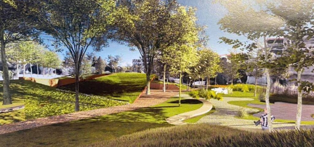 Στο πάρκο διαμορφώνονται διαδρομές και διευρυμένες περιοχές-πλατώματα που περιλαμβάνουν καθιστικά, τεχνητά πρανή- λοφίσκους χαμηλού ύψους με φυτεύσεις και γκαζόν, καθώς και μία μικρή τεχνητή λίμνη με το φυσικό της περιβάλλον, επιφάνειας, 27,00τ.μ. Βασικό κριτήριο, κατά την επιλογή των υλικών είναι η χρήση συμβατών προς το περιβάλλον υλικών, η τήρηση αυστηρών περιβαλλοντικών προδιαγραφών και προδιαγραφών ασφάλειας.