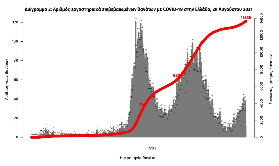 Οι νέοι θάνατοι ασθενών με COVID-19 είναι 37, ενώ από την έναρξη της επιδημίας έχουν καταγραφεί συνολικά 13.636 θάνατοι. Το 95.3% είχε υποκείμενο νόσημα ή/και ηλικία 70 ετών και άνω.
