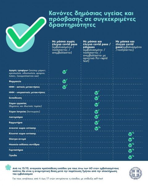 Στα καταστήματα λιανικού εμπορίου, στους ανοικτούς (εξωτερικούς) χώρους εστίασης, στα κομμωτήρια, στους χώρους παροχής υπηρεσιών αισθητικής και άλλους χώρους με συναφείς δραστηριότητες ή παροχής υπηρεσιών δυνατότητα πρόσβασης έχουν οι εμβολιασμένοι ή εντός των τελευταίων έξι (6) μηνών νοσήσαντες από τη νόσο COVID-19 και οι ανεμβολίαστοι ενήλικοι συμπολίτες μας που έχουν υποβληθεί σε διαγνωστικό έλεγχο με PCR ή rapid test πριν από την παρουσία τους στο κατάστημα.