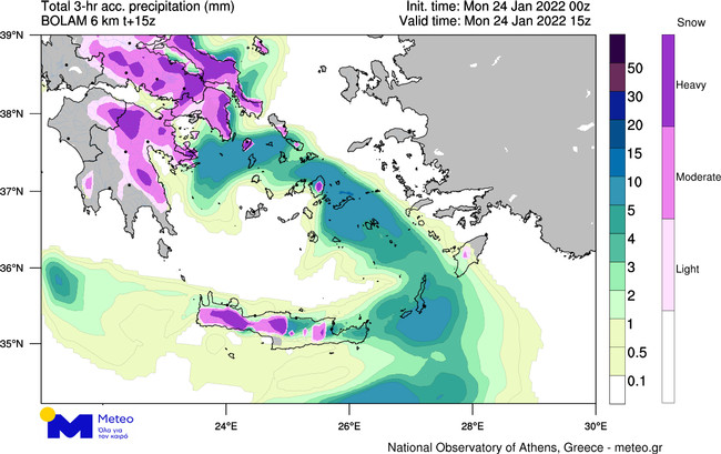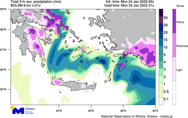 Στην παρακάτω ομάδα χαρτών, εμφανίζεται το εκτιμώμενο ύψος υετού ανά τρίωρο (μωβ αποχρώσεις χιόνι και μπλε αποχρώσεις βροχή/χιονόνερο), όπως υπολογίζεται από το αριθμητικό μοντέλο πρόγνωσης καιρού του Εθνικού Αστεροσκοπείου Αθηνών / Meteo.gr, για επιλεγμένα τρίωρα έως το βράδυ της Δευτέρας 24/01/2022.
