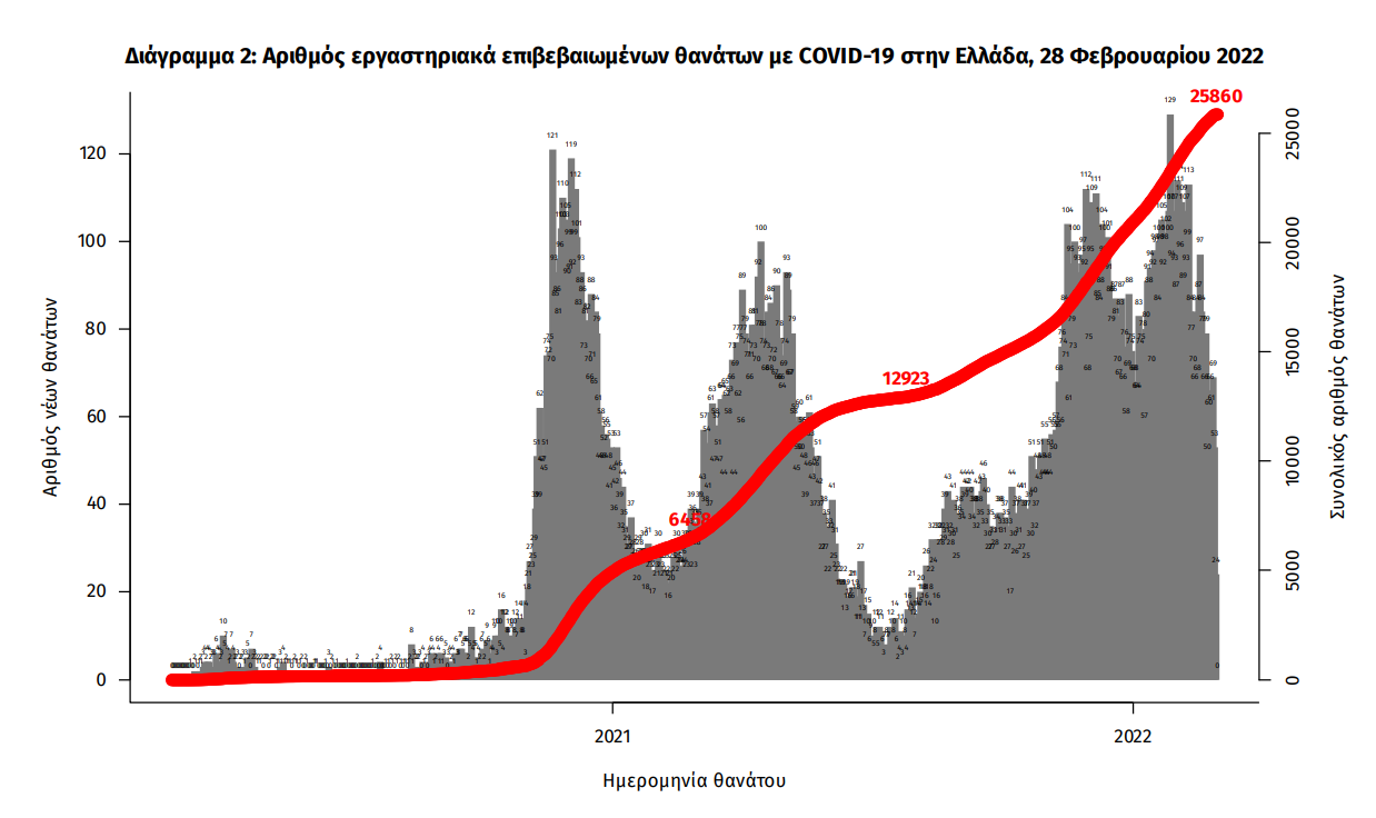 Οι νέοι θάνατοι ασθενών με COVID-19 είναι 70, ενώ από την έναρξη της επιδημίας έχουν καταγραφεί συνολικά 25.860 θάνατοι. Το 95.1% είχε υποκείμενο νόσημα ή/και ηλικία 70 ετών και άνω.