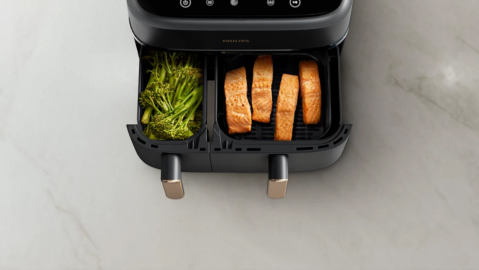 Το νέο PHILIPS Airfryer NA352 διαθέτει δύο κάδους, ένα μεγάλο που είναι ιδανικός για τα κυρίως γεύματα, τις τηγανητές πατάτες και ό,τι άλλο λαχταράς και ο μικρότερος κάδος για τα συνοδευτικά, τα λαχανικά και τα σνακ. Μπορείς να ρυθμίσεις γρήγορα τον ίδιο χρόνο και θερμοκρασία μαγειρέματος για τους δύο κάδους με το πάτημα ενός κουμπιού, είτε να ρυθμίσεις τον τρόπο μαγειρέματος σε κάθε κάδο ξεχωριστά ώστε τα φαγητά σου να είναι έτοιμα την ίδια στιγμή για σερβίρισμα, φρέσκα και ζεστά. Με ισχύ 2750W, το PHILIPS Airfryer NA352 εξασφαλίζει γρήγορο μαγείρεμα χωρίς αναμονή. O κάδος 9 Lt καλύπτει τις ανάγκες όλης της οικογένειας, ενώ οι 8 προκαθορισμένες λειτουργίες μαγειρέματος σου επιτρέπουν να προετοιμάσεις το φαγητό με τον τρόπο που επιθυμείς.